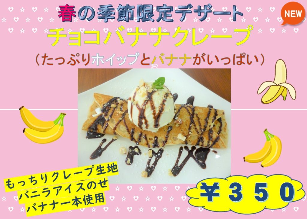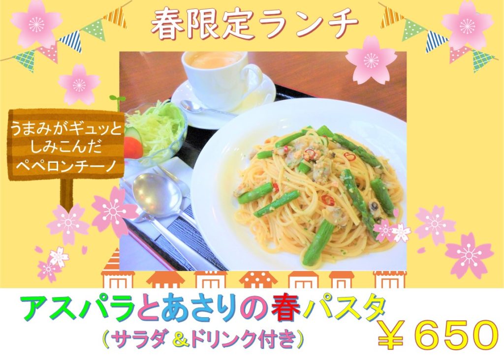 2021年4月2日 / 最終更新日時 : 2021年4月2日 桂の泉学園 喫茶いづみ 「喫茶いづみ」春限定メニュー【アスパラとアサリの春パスタ&チョコバナナクレープ】 新年度が始まり、喫茶いづみも春の訪れとともに爽やかにスタートをきりました!春の季節限定メニューがスタートしましたので、みなさん是非ご賞味くださいね。 アサリのうま味ぎゅっとつまっています! もちもちクレープとバナナの相性が抜群です!おいしいですよ^^ コメントを残す コメントをキャンセルメールアドレスが公開されることはありません。 ※ が付いている欄は必須項目ですコメント ※ 名前 ※ メール ※ サイト 次回のコメントで使用するためブラウザーに自分の名前、メールアドレス、サイトを保存する。 Δ